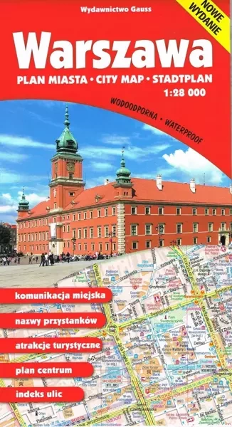 Plan Warszawy, w wersji wodoodpornej, opracowany w pełnych granicach administracyjnych. Opracowanie obejmuje także Łomianki oraz fragmentarycznie przyległe miasta i wsie. Plan zawiera m.in: • komunikację miejską, strefy parkowania, parkingi P+R • zabytki, kościoły, ambasady, muzea, kina i teatry • granice dzielnic i części miast • stacje paliw, centra handlowe i supermarkety • obiekty noclegowe • poczty, agencje pocztowe • tereny przemysłowe, lasy, parki, cmentarze i ogródki działkowe Na odwrocie planu umieszczono indeks ulic i plan centrum w skali 1:15 000. Legenda planu opracowana jest w języku polskim, angielskim i niemieckim.