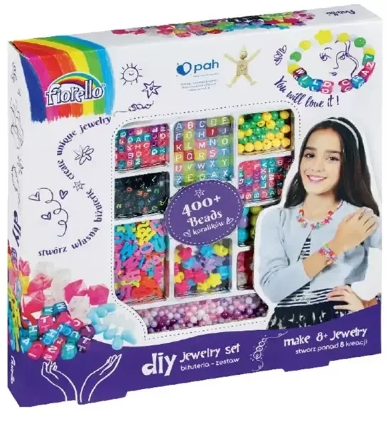 Zestaw kreatywny FIORELLO pozwala na tworzenie własnych, oryginalnych ozdób dzięki zawartym w nim ponad 400 elementom. W skład zestawu wchodzą koraliki, alfabet w postaci charmsów, żyłki, gumki oraz różne inne akcesoria, które ułatwiają tworzenie niesamowitej biżuterii.W pełni bezpieczne i zgodne z normami UE