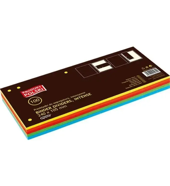 Kartony kompatybilne ze wszystkimi segregatorami umożliwiające łatwe rozłożenie notatek, dokumentów czy faktur. Skonstruowane tak, by można je było wpiąć zarówno pionowo, jak i poziomo, dzięki czemu są uniwersalne i praktyczne w użyciu. Wymiary przekładek to 240x105 mm, co gwarantuje idealne dopasowanie do większości segregatorów dostępnych na rynku. Wybór spośród 5 nasyconych kolorów sprawia, że przekładki są nie tylko funkcjonalne, ale także estetyczne. Bardzo żywe odcienie ułatwiają organizację dokumentów oraz wpłynąć na atrakcyjność wizualną biura czy miejsca pracy. Każdy pakiet zawiera 100 sztuk przekładek, co pozwala na kompletne wyposażenie biura, szkoły czy domowego kącika do pracy.EAN: 5903364254810