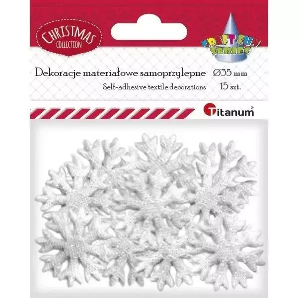 Apelujące estetycznie dekoracje materiałowe od Titanum prezentują cechy samozwancze umożliwiając ich łatwe przymocowanie. Są to elementy, które posiadają kształt płatków śniegu.Kolor i Wymiar