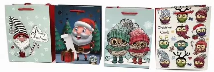Mniejsza pionowa torebka świąteczna w różnorodnych wzorach. O wymiarach 18X23X10.