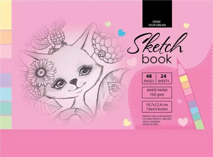 Szkicownik 197x124 mm, 48 stron, gramatura papieru 100g/m2. Ołówki, kredki, markery, mazaki, pędzle - tych rzeczy możesz użyć w tym szkicowniku! Namaluj swoje marzenia!