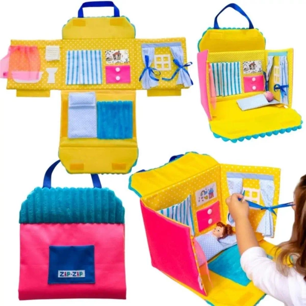 Przy okazji zabawy z domeczkiem, dziecko nauczy się manewrować elementami wnętrza, obsługiwać rzepy przy oknach, wiązać węzełki oraz pomoże mu to rozwijać wyobraźnię i zdolności manualne.Przenośny i poręczny