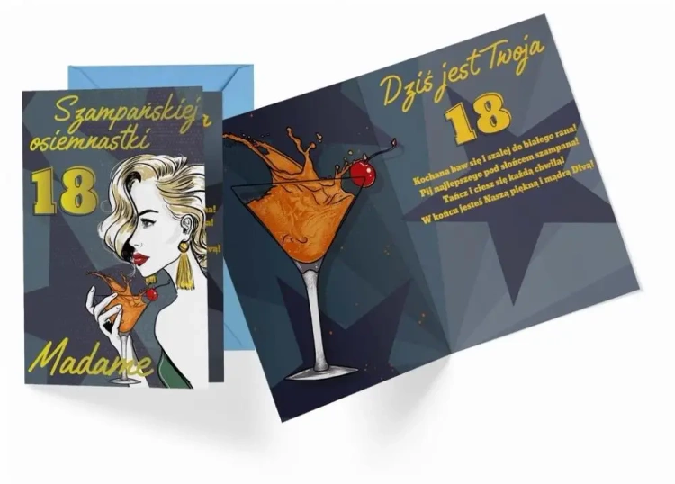 Wewnątrz kartki znajduje się kolorowa grafika oraz tekst niebanalnych życzeń na osiemnaste urodziny. Kompozycja ta czyni z kartki PR 393 wyjątkowy i niepowtarzalny prezent.Cechy produktu