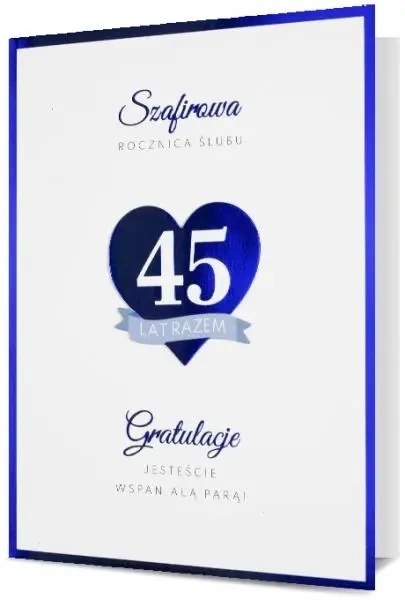 Prezentujemy specjalny karnet na okazję Szafirowej Rocznicy Małżeństwa. Produkt jest w formacie B6 i dostarczany razem z kopertą.