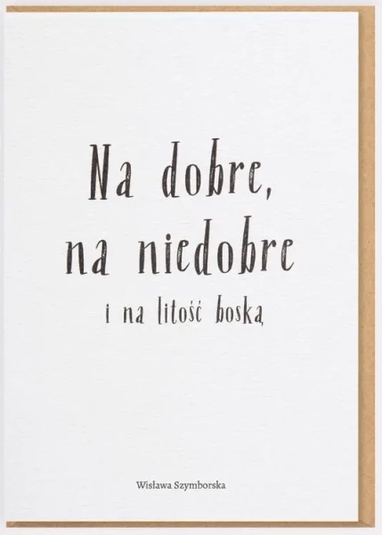 Karnet "Na dobre, na niedobre i na litość boską" stanowi niesamowitą okolicznościową kartkę usprawnioną wybitnym polskim wierszem. Jest to dzieło natchnione jednym z najbardziej znanych i równocześnie najbardziej poruszających utworów autorstwa Wisławy Szymborskiej, zatytułowanym "Portret Kobiecy". Minimalistyczny, lecz pociągający wzór karnetu jest doskonałym komplementem do upominku weselnego, kartki z okazji rocznicy małżeństwa lub prezentu na walentynki. Każdy obdarowany, który jest miłośnikiem polskiej literatury, a zwłaszcza poezji noblistki, z pewnością doceni ten wyjątkowy gest. Wewnątrz karnetu znajduje się pusta przestrzeń do wypełnienia. Wyraź swoje uczucia i przemyślenia, pisząc własnoręcznie tekst, który bierze swoje źródło prosto z Twojego serca! Wiadomość, jaką chcesz przekazać, z pewnością nabierze wyjątkowego uroku na tle ekologicznego papieru, na którym został wydrukowany karnet. Kartka jest dostępna w zestawie z kopertą, co umożliwiające eleganckie wręczenie upominku.EAN: 5902001001121