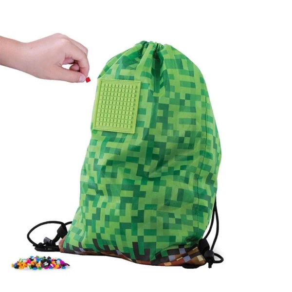 Wyposażony w długi, wysuwany sznurek, ułatwia przymocowanie do plecaka, zarzucenie na ramię lub zakładanie na plecy. Dodatkowo, wewnątrz worka znajdziemy praktyczną kieszeń na suwak. Na jego przedniej stronie umieszczono zielony, kreatywny panel PIXIE CREW TM, wykonany z najwyższej jakości silikonu. Panel posiada niewielkie występy w kształcie litery "T", na które można montować małe płytki - piksele oraz multipiksele z obrazkami, tworząc własne grafiki albo korzystać z gotowych szablonów. Wielkość panelu (10 x 10 punktów) pozwala na ułożenie wzorów z 97 pikseli.