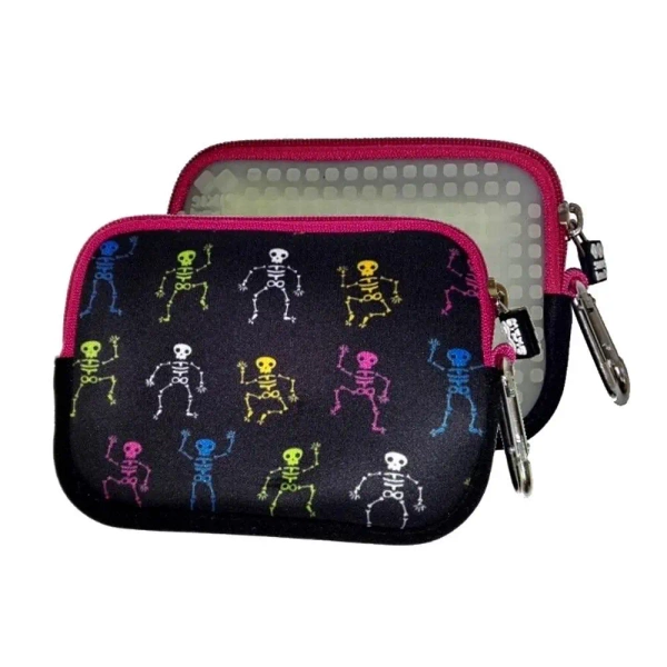 Uniwersalna saszetka PIXIE CREW w kolorze czarnym z wzorem kolorowych szkieletów i innowacyjnym panelem świecącym w ciemności, na którym można tworzyć niepowtarzalne i spersonalizowane grafiki za pomocą małych silikonowych pikseli. Wykonana z praktycznego i odpornego na wstrząsy oraz uderzenia neoprenu, zapewniającego ochronę zawartości. Saszetka zapinana na suwak, wyposażona w karabińczyk umieszczony z boku, ułatwiający przypięcie jej w dowolnym miejscu. Wewnątrz znajduje się wystarczająco dużo przestrzeni na drobne przedmioty codziennego użytku, takie jak klucze, kosmetyki, karty, pieniądze czy inne gadżety. Saszetka sprzedawana wraz z darmowym zestawem około 100 kolorowych pikseli.