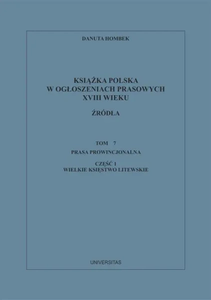 Pierwsza część siódmego tomu edycji tekstów źródłowych, która jest częścią wydawnictwa o tytule Książka polska w ogłoszeniach prasowych XVIII wieku. Źródła, prezentuje zbiór historycznych ogłoszeń związanych z polskim piśmiennictwem. Publikacja ta skupia się na reklamach druków zwartych, ulotek i periodyków, oddając przy tym różnorakie informacje na temat rynku książki oraz prasy w Polsce.Źródła litewskich gazet
