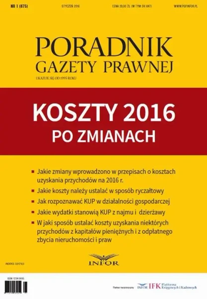 Z początkiem 2016 r. w ustawach o podatkach dochodowych wprowadzono kilka istotnych zmian dotyczących kosztów uzyskania przychodów. Z publikacji Czytelnik dowie się m.in., jak od 2016 roku: - rozliczać dla celów KUP niezapłacone faktury, - korygować KUP, - kwalifikować wydatki związane z obejmowaniem dzieci pracowników opieką. Ponadto opracowanie obszernie omawia: - zasady rozpoznawania kosztów uzyskania przychodów z działalności gospodarczej, - rodzaje kosztów ustalanych w sposób ryczałtowy oraz zasady ich rozliczania, - sposoby ustalania KUP z najmu i dzierżawy, - zasady ustalania kosztów od niektórych przychodów z kapitałów pieniężnych, - sposoby ustalania i rozliczania kosztów uzyskania przychodów z odpłatnego zbywania nieruchomości i niektórych praw.