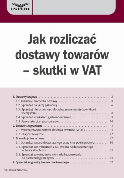 Jedną z czynności, które podlegają opodatkowaniu VAT, jest dostawa towarów. Rozliczenie tych transakcji sprawia wiele problemów. Publikacja odpowiada m.in. na pytania: • Jak ustalić moment dostawy • Jak określić miejsce dostawy przy transakcjach łańcuchowych • Jak ustalić czy miała miejsce dostawa czy usługa • Gdzie rozliczyć dostawy towarów montowanych • Jakie warunki należy spełnić przy dostawach towarów do innych krajów UE • Kiedy rozliczyć dostawy dokonywane za granicę • Jak rozliczyć transakcje łańcuchowe