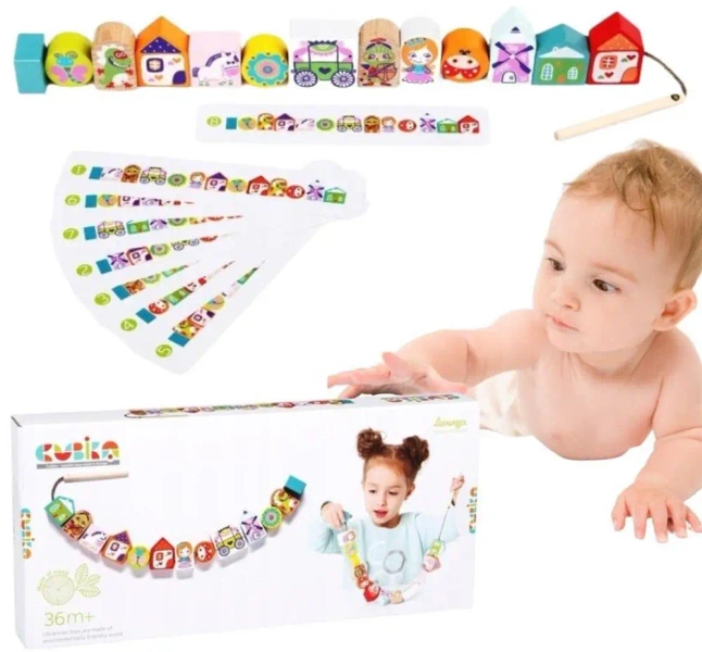Drewniana zabawka do sznurowania Cubika - kreatywna zabawa z postaciami z bajek