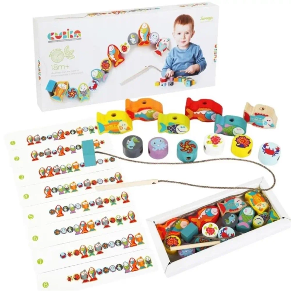 Zabawka edukacyjna Sznurowanie rybek Cubika składa się z 12 drewnianych klocków z kolorowymi ilustracjami przedstawiającymi różnorodne gatunki ryb. Figurki te służą do zabawy, a także do nawlekania na specjalny sznurek z blokadą, za pomocą długiej drewnianej igły, przez sitodruki z otworami w każdym elemencie w określonej sekwencji.