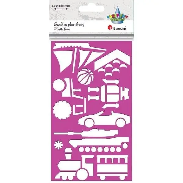 Szablon plastikowy o wymiarach 105x180 mm o tematyce chłopięcej (klocki, pojazdy, roboty)