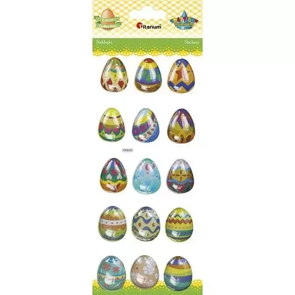 Zestaw wypukłych naklejek przedstawiających pisanki wielkanocne. Wymiary naklejek to 24 x 30 mm oraz 25 x 31 mm. W opakowaniu znajduje się łącznie 15 sztuk.