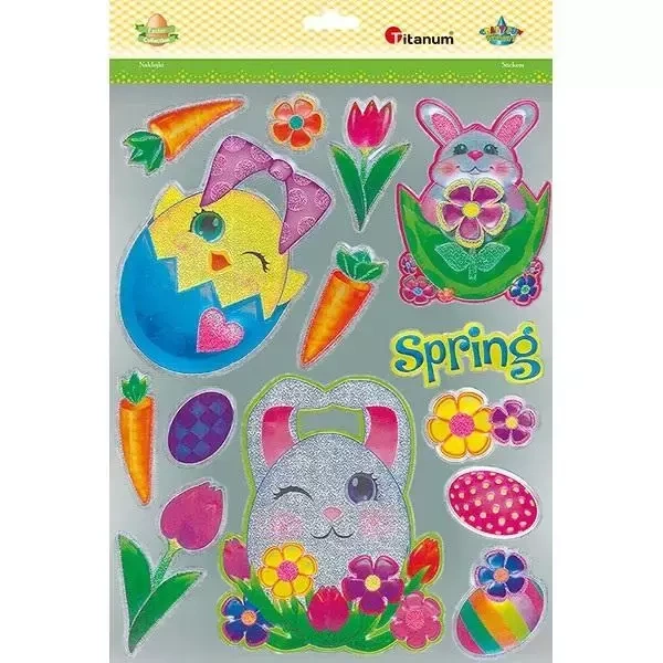 Zestaw zawiera 14 metalicznych naklejek foliowych w różnorodnych, wiosennych wzorach. Wśród nich znajduje się napis "Spring" czyli "Wiosna", figury króliczków i małego kurczaczka ukrytego w wielobarwnych pisankach wielkanocnych, wizerunki kuszących marchewek, a także różnorodne kwiaty i pisanki.