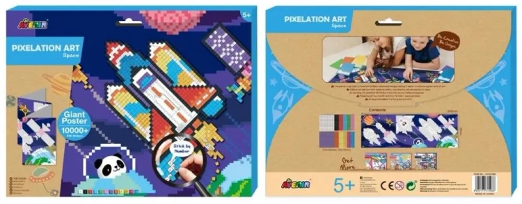 Eksploruj kosmiczną przygodę z Kolorowymi pikselami Kosmos Avenir - innowacyjną propozycją od Avenir, która wprowadza dzieci w fascynujący świat pikselowego rysowania. Oto co ma do zaoferowania ten niezwykły zestaw: 1) Gigantyczny plakat z grafiką kosmiczną: Ten imponujący plakat o wymiarach 84 x 29 cm uwodzi swoim wzornictwem oraz żywą kolorystyką. Przedstawia kosmiczne rakiety oraz inne elementy związane z podróżami w kosmos. 2) 800 naklejek z pianki EVA: Nagłówkiem przeznaczonym do zabawy są 800 kolorowych naklejek wyprodukowanych z bezpiecznej dla dzieci pianki EVA. Dzieci mogą korzystać z nich bez obaw o szkodliwe substancje. 3) Edukacyjna zabawa: Zadaniem dziecka jest odpowiednie przyporządkowanie kolorowych naklejek do numerowanych kwadratów, wypełniając plakat pikselowe wzory. Proces ten uczy dziecko rozpoznawania liczb, koordynacji ruchowej oraz cierpliwości. Kolorowe piksele Kosmos Avenir jest doskonałym pomysłem na prezent dla dzieci w wieku 7+ lat, które pragną odkrywać artystyczne zdolności oraz zachwycić się światem kosmicznych podróży. Szeroko rozbudowane możliwości zabawy zgłębialają kreatywność młodszych oraz zachęcają do systematycznego angażowania się w shaping dzieła.EAN: 6920773315986