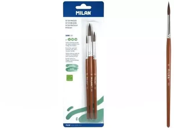 Zapraszamy do zapoznania się z ofertą na zestaw trzech wielkości okrągłych pędzli szkolnych MILAN. Numery pędzli w zestawie to 6, 10 i 14, wszystkie z serii 101, wyposażone w krótkie drewniane trzonki. Pędzle zostały wykonane z mieszanki 70% naturalnego koziego włosia i 30% syntetycznego.