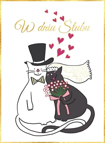 Zestaw ślubny obejmuje stylowy karnet B6 i dopasowaną kopertę. Inspirująca kreacja, która doskonale oddaje szczęśliwą atmosferę dnia ślubu z intrygującym motywem kotów i serc. Karnet jest wydrukowany na papierze o wysokiej jakości, dodatkowo przyozdobiony jest złoto, co nadaje mu wyjątkowo elegancki wygląd. Załączona koperta doskonale dopełnia całość, czyniąc z tego zestawu idealny wybór na prezent ślubny. Dzięki temu, para młoda na pewno doceni twój gust i oryginalność. Urocze koty i serca, które ozdabiają karnet, dodadzą uroku i ciepła każdemu odczytanemu słowu.EAN: 5907465665292