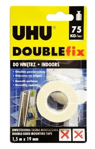 Prezentujemy dwustronną taśmę montażową UHU Extra Mocna o wymiarach 19 mm x 1,5 m. Posiadająca wysoką siłę klejenia, zapewnia trwałe i niezawodne mocowanie różnego rodzaju przedmiotów.