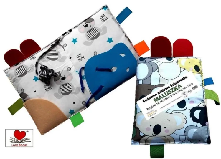 Różne tekstury materiałów pobudzają zmysły dziecka, sprawiają, że przyciąga ich uwagę i zachęca do aktywnego spędzania czasu z książeczką.