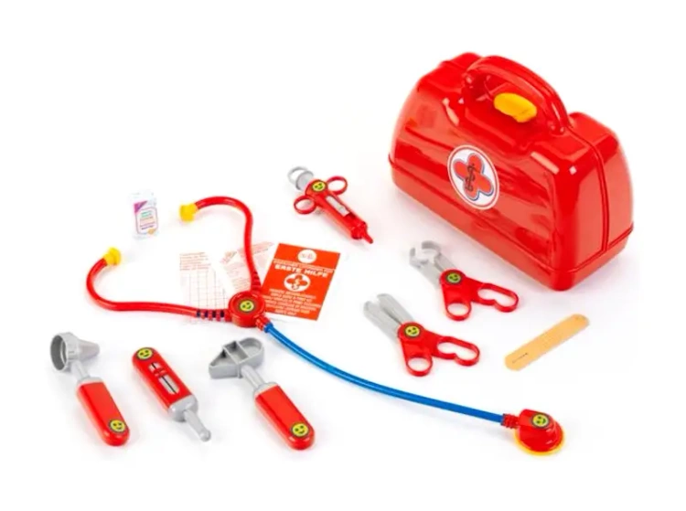 Produkty sygnowane logo Klein to szereg różnorodnych zestawów lekarskich, od indywidualnych elementów takich jak autentyczny stetoskop czy fartuch medyczny, po złożone zestawy obejmujące pełne wyposażenie dla małego lekarza czy ratownika. Każde dziecko, które zna zastosowanie termometru, strzykawki czy plastrow, próbuje naśladować prawdziwego lekarza, biorąc pod lupę swoje zabawki czy członków rodziny. Dlatego właśnie produkty Klein są doskonałe, wykonane z najwyższą starannością o szczegóły. Więcej niż zestaw lekarski - trapezoidalna walizka zawierająca podstawowe wyposażenie medyczne. Czerwona walizka, utrzymana w klasycznym stylu, wykonana z ultrawytrzymałego materiału, posiada użyteczny uchwyt dla łatwości przenoszenia oraz żółty klips zapobiegający niechcianemu otwieraniu. Ten niesamowity zestaw składa się z 10 elementów, które są proste do użycia i całkowicie bezpieczne dla dzieci. Różnorodne elementy zawarte w walizce: - stetoskop, - plastikowe nożyczki, - szczypce, - strzykawka, - termometr, - otoskop, - młoteczek, - pojemnik na waciki, - elastyczny plasterek, - notatnik. Wymiary walizki to: 24 x 11 x 19 cm, a jest przeznaczona dla dzieci powyżej 3 roku życia. Zaufana marka Klein, jest rozpoznawalna na całym świecie za swoje produkty o najwyższym standardzie, wykonane z doskonałej jakości materiałów i atrakcyjnego designu. Te zabawki spełniają oczekiwania zarówno młodszych, jak i starszych użytkowników. Produkty z logo Klein zapewniają doskonałą rozrywkę oraz wyróżniają się długim okresem użytkowania.EAN: 4009847044570
