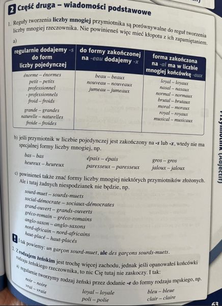 Nie będę ukrywa, że gramatyka francuska zawsze wydawała mi się trochę jak błądzenie we mgle. Niby coś pamiętam z lekcji, coś kiedyś przerabiałam, ale jak przyszło co do czego, to kończyło się na zgadywaniu, czy czasem nie powinno być jednak „être” zamiast „avoir”. Dlatego sięgnęłam po ten zbiór z konkretnym zamiarem: uporządkować wszystko od podstaw, we własnym tempie, bez presji. I już teraz mogę powiedzieć, że to był bardzo dobry wybór, bo ta książka jest naprawdę... konkretna. Działy są jasno posegregowane, czyli od najprostszych zagadnień po coraz bardziej zaawansowane, więc bez względu na to, czy dopiero zaczynasz, czy chcesz powtórzyć coś sprzed lat, znajdziesz coś dla siebie. Do tego mnóstwo ćwiczeń (i to nie takich na zasadzie „wpisz jedno słówko”, tylko naprawdę pomagających zrozumieć konstrukcję i logikę języka). Korzystam z tej gramatyki trochę jak z codziennego treningu, moja metoda to po kilka stron dziennie, długopis w rękę, zeszyt do notatek i działam. I serio widzę efekty: mniej wątpliwości, więcej pewności przy tworzeniu zdań. Podoba mi się też to, że nie jest przeładowana teorią, a wszystko jest zbalansowane tak, żeby nie zanudzić, ale jednak porządnie przećwiczyć materiał.