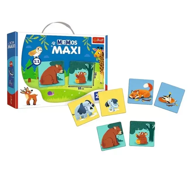 Memo Maxi to doskonała opcja na pierwszą grę, której celem jest trening pamięci Twojego malucha. Kierując się zasadą pasowania identycznych kafelków, gracz na celu ma zgromadzenie jak największej liczby par. W produkcję gry wchodzi 24 duże kafelki i dołączona do zestawu instrukcja.