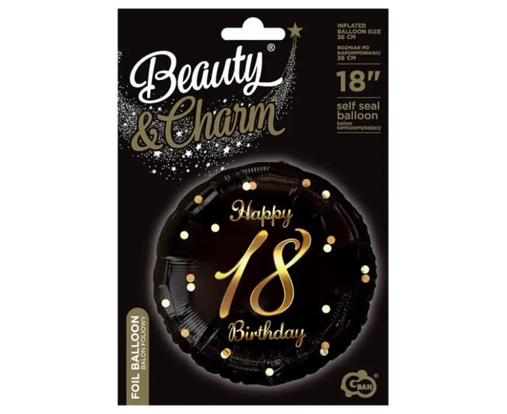 Prezentujesz oryginalny i niezapomniany prezent na 18. urodziny? Ten balon foliowy z liczbą 18 oraz napisem Happy 18 Birthday może być właśnie tym, czego potrzebujesz. Balon ma wymiary 45 cm (18") i jest okrągły, a jego tło to kolor czarny z eleganckim, złotym wzorem. Wyprodukowany przez Godan S.A. w ramach kolekcji Beauty&Charm, balon może stać się uroczą ozdobą na imprezę urodzinową.