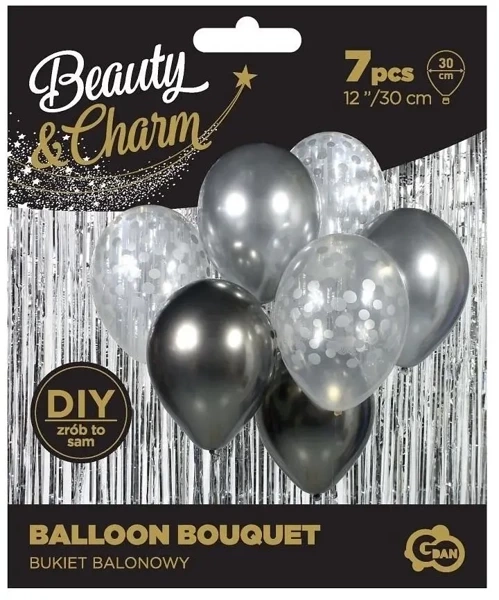 Niezapomnianą dekoracją każdej imprezy, sylwestra, wieczoru panieńskiego czy wesela może być bukiet balonowy Beauty&Charm w kolorze srebrno-grafitowym. Stwórz wyjątkowe kompozycje z balonów, które ożywią każde wnętrze lub przekaż je jako niebanalny prezent!
