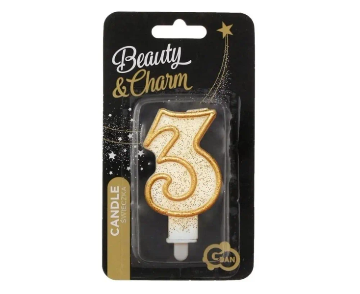 Świeczka cyfra 3 urodziny, złoty kontur - Godan
