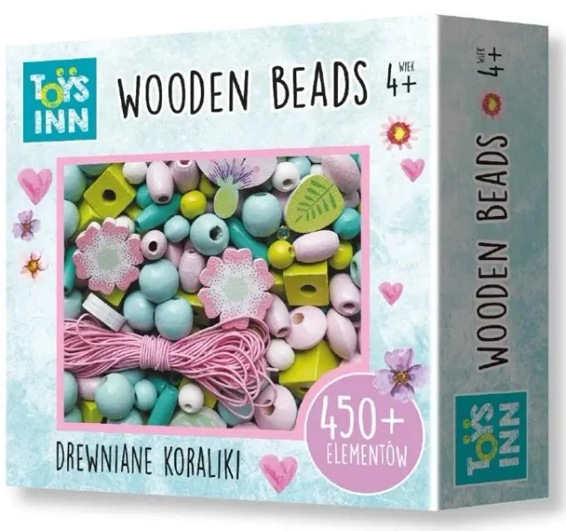 - blisko 450 sztuk różnorodnych koralików drewnianych o zróżnicowanych kształtach i rozmiarach,