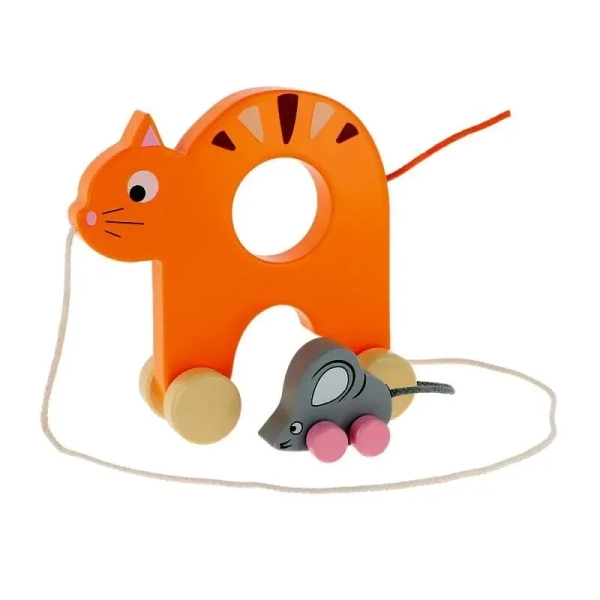 Drewniany kotek z myszką na kółkach - idealna zabawka dla maluchów