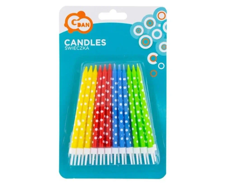Niezapomniane przyjęcie urodzinowe dla twojego dziecka wymaga pięknej dekoracji na torcie. Te świeczki w grochy to idealny dodatek. Ozdobione są białymi kropeczkami, które dodają im uroku. Świeczki dostępne są w 4 różnych kolorach, więc na pewno pasują do każdej aranżacji stołu. Każdy zestaw zawiera 24 sztuki tych uroczych świeczek urodzinowych.