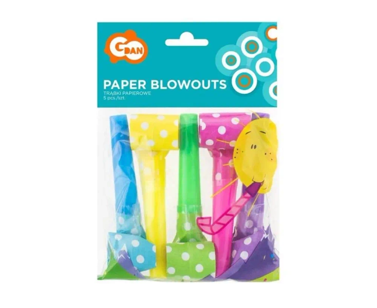 Komplet trąbek kolorowych, ozdobionych białymi groszkami, składa się z 5 różnobarwnych sztuk. Wykonane są one z papieru i plastiku, co gwarantuje ich trwałość i solidność. Każda z trąbek wyposażona jest w plastikowy ustnik, który zapewnia komfort używania.