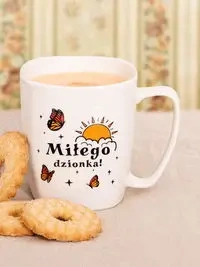 Nadruk po dwóch stronach kubka SMACZNEJ KAWUSI / MIŁEGO DZIONKA, logo na spodzie