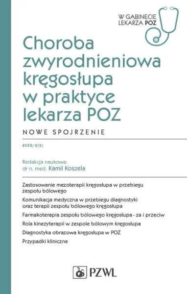Dysfunkcje kręgosłupa i tkanek okołokręgosłupowych stanowią jeden z głównych problemów zdrowotnych, z jakimi spotyka się lekarz POZ w swojej codziennej praktyce - zarówno na etapie wstępnej diagnostyki, jak i prowadzenia pacjenta z chorobami przewlekłymi. O tym, co jest istotne w rozpoznaniu i leczeniu oraz profilaktyce w opiece ambulatoryjnej choroby zwyrodnieniowej kręgosłupa, traktuje monografia pod redakcją naukową dr n. med. Kamila Koszeli. Jest to praktyczny zespół drogowskazów, rad i wskazówek dla lekarza rodzinnego dotyczących postępowania z pacjentem z chorobą zwyrodnieniową kręgosłupa. Publikacja dedykowana jest lekarzom POZ, ale może też być intersująca dla studentów medycyny, jak i lekarzy wielu innych specjalności, którzy w sowiej codziennej praktyce zajmują się tą populacją chorych.