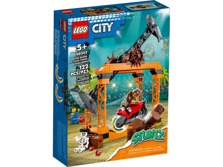 - Zawartość zestawu: oprócz modelu Wyzwanie kaskaderskie: atak rekina, w zestawie znajduje się motocykl kaskaderski, szkielet oraz dwie minifigurki, w tym postać z serialu telewizyjnego LEGO® City Adventures.