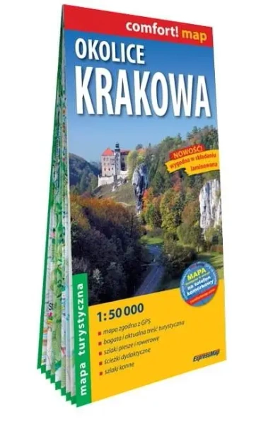 Dwustronnie laminowana, wygodna w składaniu mapa turystyczna okolic Krakowa obejmuje obszar od Ojcowskiego Parku Narodowego na północy, po Niepołomice na wschodzie, Myślenice i Jezioro Dobczyckie na południu oraz Kalwarię Zebrzydowską i Krzeszowice na zachodzie. Publikacja została opracowana we współpracy z doświadczonymi krajoznawcami z regionu.