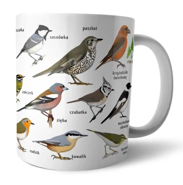 Niezwykły kubek prezentujący różnorodne gatunki ptaków leśnych - doskonały jako prezent!