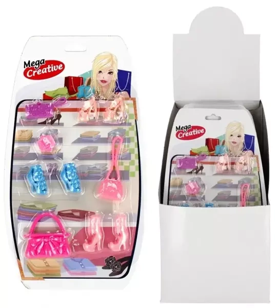 W skład zestawu wchodzą 3 pary butów, 3 różne torebki oraz spinka do włosów. Elementy wykonane są z plastiku, a wymiary opakowania to 14x25x2 cm, zaś wymiary DISPLAYA wynoszą 15x25x22 cm. Cały zestaw waży 0,04 kg, a DISPLAY - 0,64 kg. Produkt nie wymaga zasilania bateriami i jest przeznaczony dla dzieci powyżej 3. roku życia.