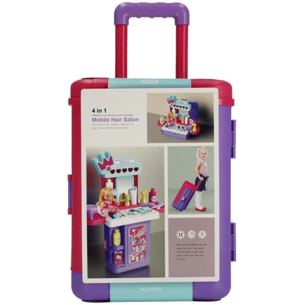 Zawartość zestawu: Walizka na kółkach, kompletny zestaw fryzjerski z różnorodnymi akcesoriami, takimi jak suszarka do włosów, 2x grzebień, nożyczki, płyn do stylizacji włosów, szampon do włosów, odżywka do włosów, itd. Wszystko wykonane z wysokiej jakości plastiku, co sprawia, że całe wyposażenie jest trwałe oraz wystarczająco bezpieczne dla dzieci w wieku 3 lat i starszych.