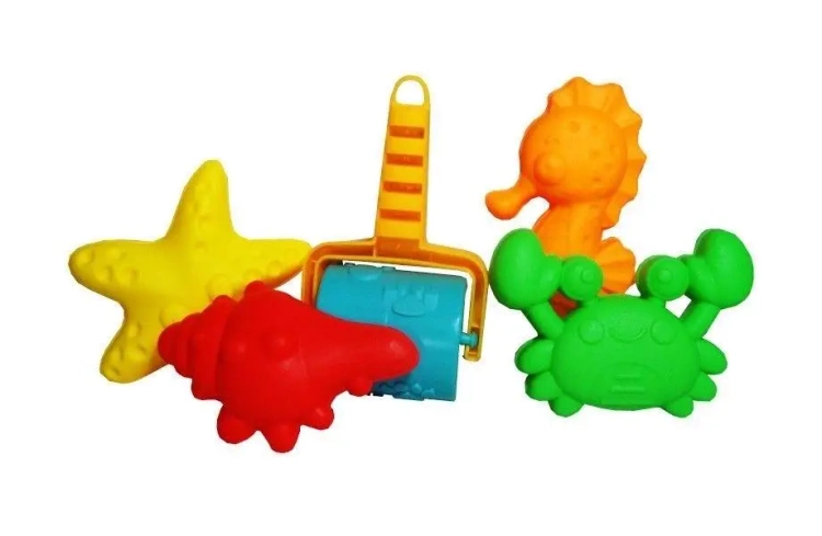 Kreatywna zabawka dedykowana dla najmłodszych, zwłaszcza dzieci, które skończyły już pierwszy rok życia. Zestaw składa się z czterech formek do piasku o tematyce morskiej, stanowiąc idealne narzędzie do twórczej zabawy na plaży lub w piaskownicy. Komplet uzupełnia praktyczny wałek.