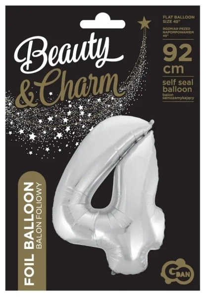 Balon foliowy Beauty&Charm w kształcie cyfry 4 to idealna dekoracja każdej imprezy, zwłaszcza tych związanych z czwartą rocznicą czy urodzinami. Świetnie sprawdzi się jako element wystroju wnętrza, a srebrny kolor doda elegancji i blasku na każdej uroczystości.Właściwości balonu