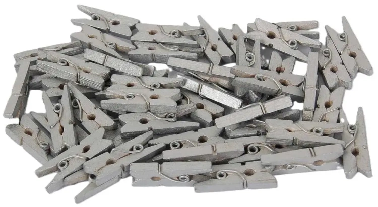 Zestaw zawiera 50 sztuk klamerek dekoracyjnych. Każda z nich ma wymiary 25 x 3 mm oraz grubość 7 mm. Wykończenie w kolorze srebrnym dodaje im elegancji i subtelnego blasku.