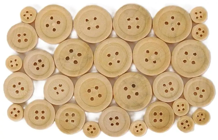 Ozdobne guziki drewniane dostępne są w różnych wymiarach. W jednym zestawie znajdują się egzemplarze o wymiarach: 10 x 1 cm, 10 x 1,5 cm oraz 10 x 2 cm. Wszystkich guzików w opakowaniu jest 30 sztuk. Cechą charakterystyczną tych guzików jest ich naturalny, drewniany wygląd.