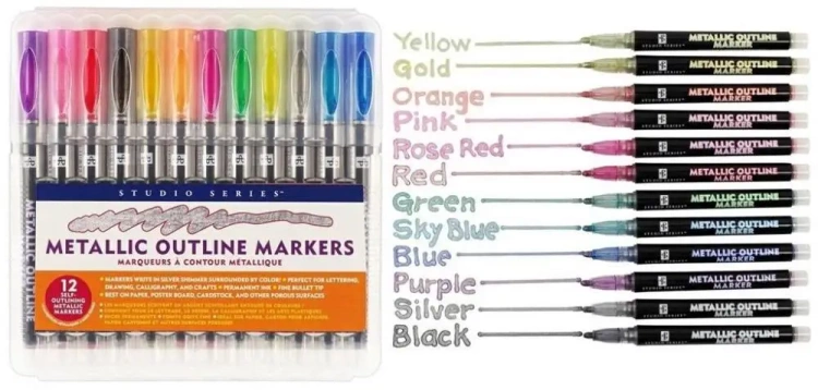 Z przyjemnością prezentujemy unikalny zestaw markerów konturowych Outline, wyprodukowanych przez cenioną firmę Peter Pauper Press. W skład zestawu wchodzi dwanaście srebrnych markerów metalicznych z różnokolorowymi konturami, stanowiących doskonałe narzędzie do ozdabiania, twórczego pisania, uprawiania kaligrafii czy wykonywania różnego rodzaju rękodzieła. Markery świetnie sprawdzają się na wszystkich porowatych powierzchniach!