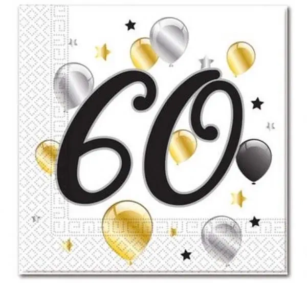 Materiał wykonania: wyprodukowane są z wysokiej jakości papieru. Serwetki są białe, zdobione unikalnym nadrukiem - czarnym napisem "60" oraz złotymi i srebrnymi ilustracjami baloników i gwiazdek.