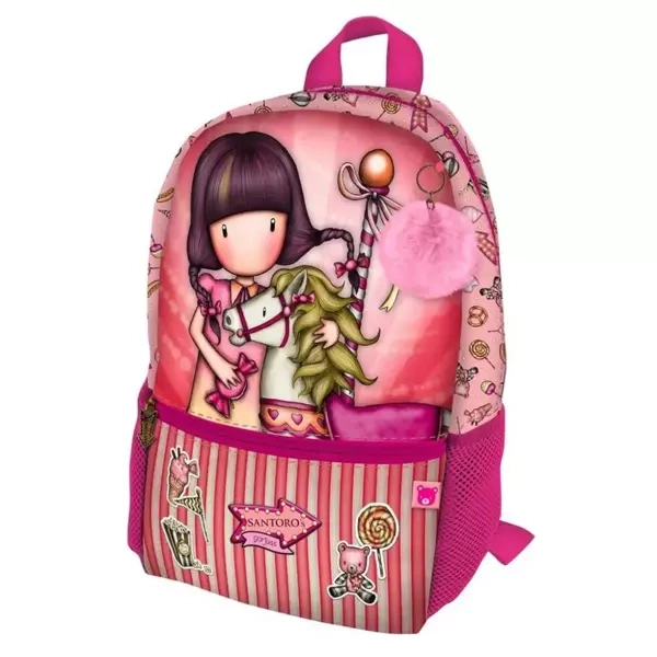 Zawitaj w magiczny świat Gorjuss dzięki wyjątkowej serii Carousel. Plecak pełen jest urokliwych detali: słodką dziewczynkę Gorjuss i jej towarzysza - konika, odmalowanych w pięknych różowych odcieniach. Znajdziesz tu wszystkie elementy charakterystyczne dla pełnego radości lunaparku - fajerwerki, bajeczne girlandy i cukrową watę.Funkcjonalny i stylowy - idealny dla każdej dziewczynki
