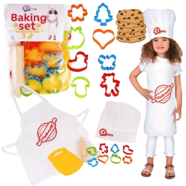Prezentowany Zestaw do pieczenia składa się z 12 elementów: fartuszka, czapki kucharskiej, ośmiu kolorowych foremek, deski oraz wałka do ciasta. Wszystkie części zestawu zostały wykonane z wysokiej jakości, bezpiecznego tworzywa sztucznego o niewyczuwalnym zapachu.